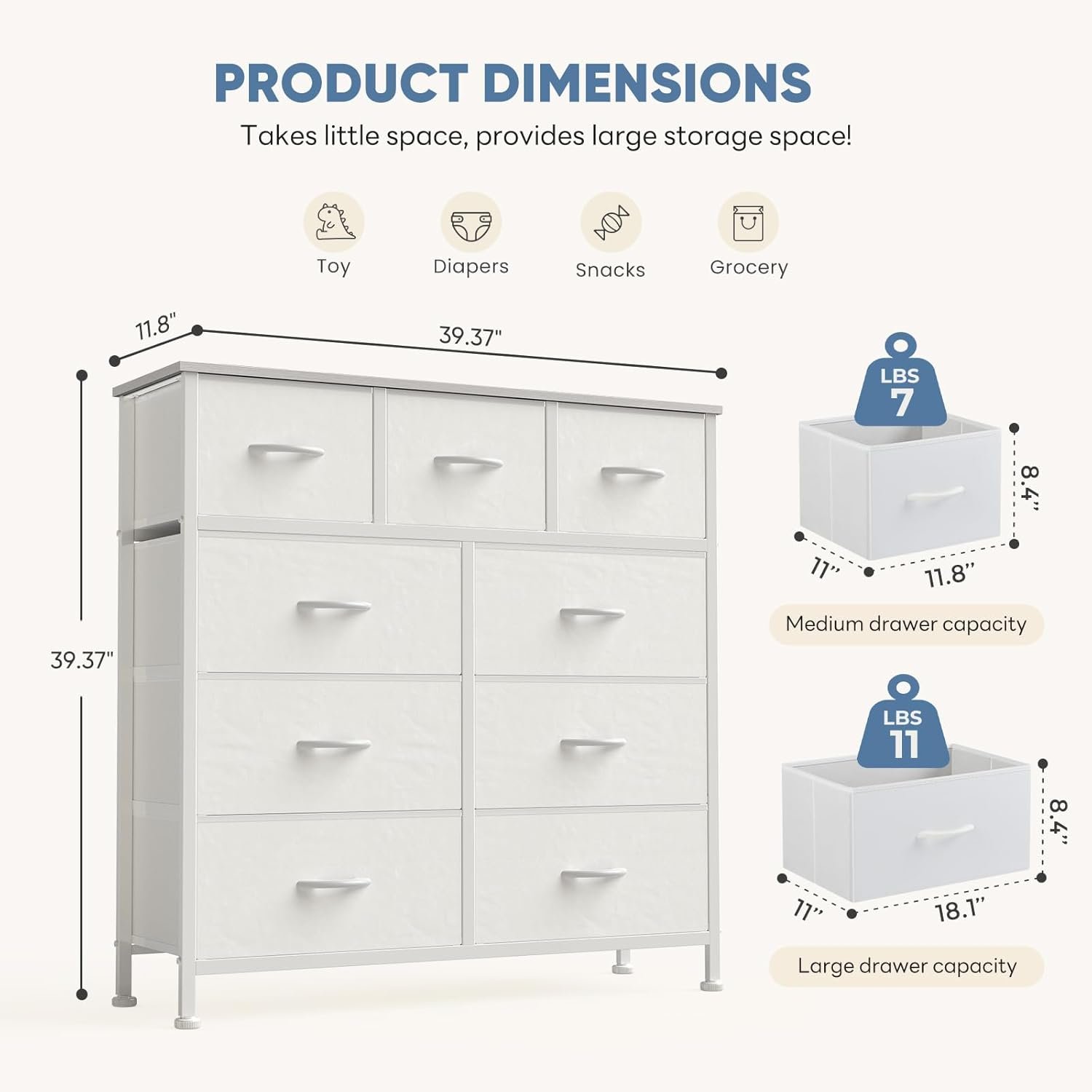 Upgrade your home storage with the DUMOS Dresser for Bedroom—a versatile organizer featuring 9 spacious fabric drawers, a sturdy metal frame, and a smooth wood tabletop for extra utility. Designed to fit seamlessly in bedrooms, guest rooms, closets, or entryways, this chest of drawers blends classic and modern styles to match any décor. Built with premium materials and anti-tipping safety features, it offers durability and peace of mind. Quick assembly and responsive customer service make it an effortless choice for stylish, practical organization.